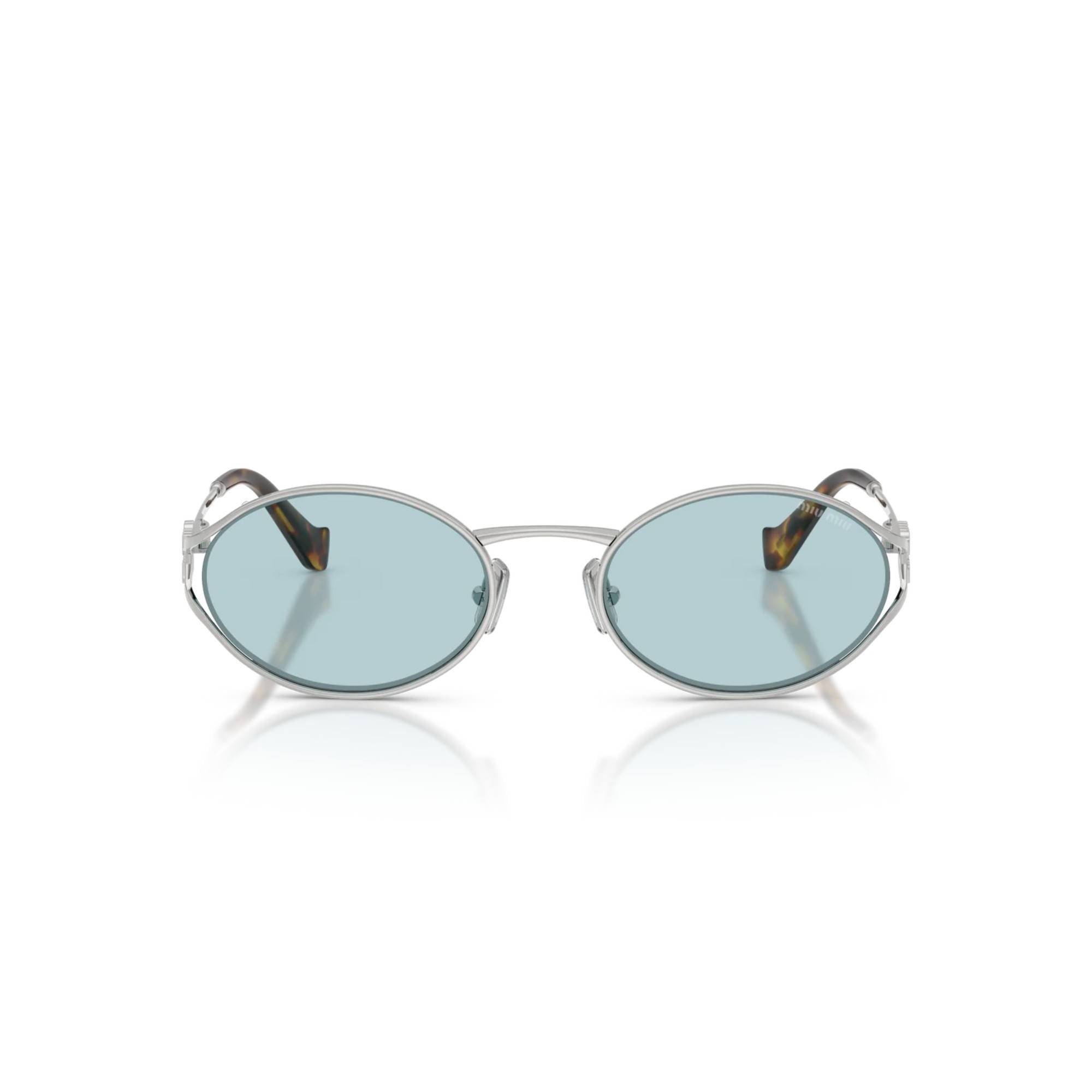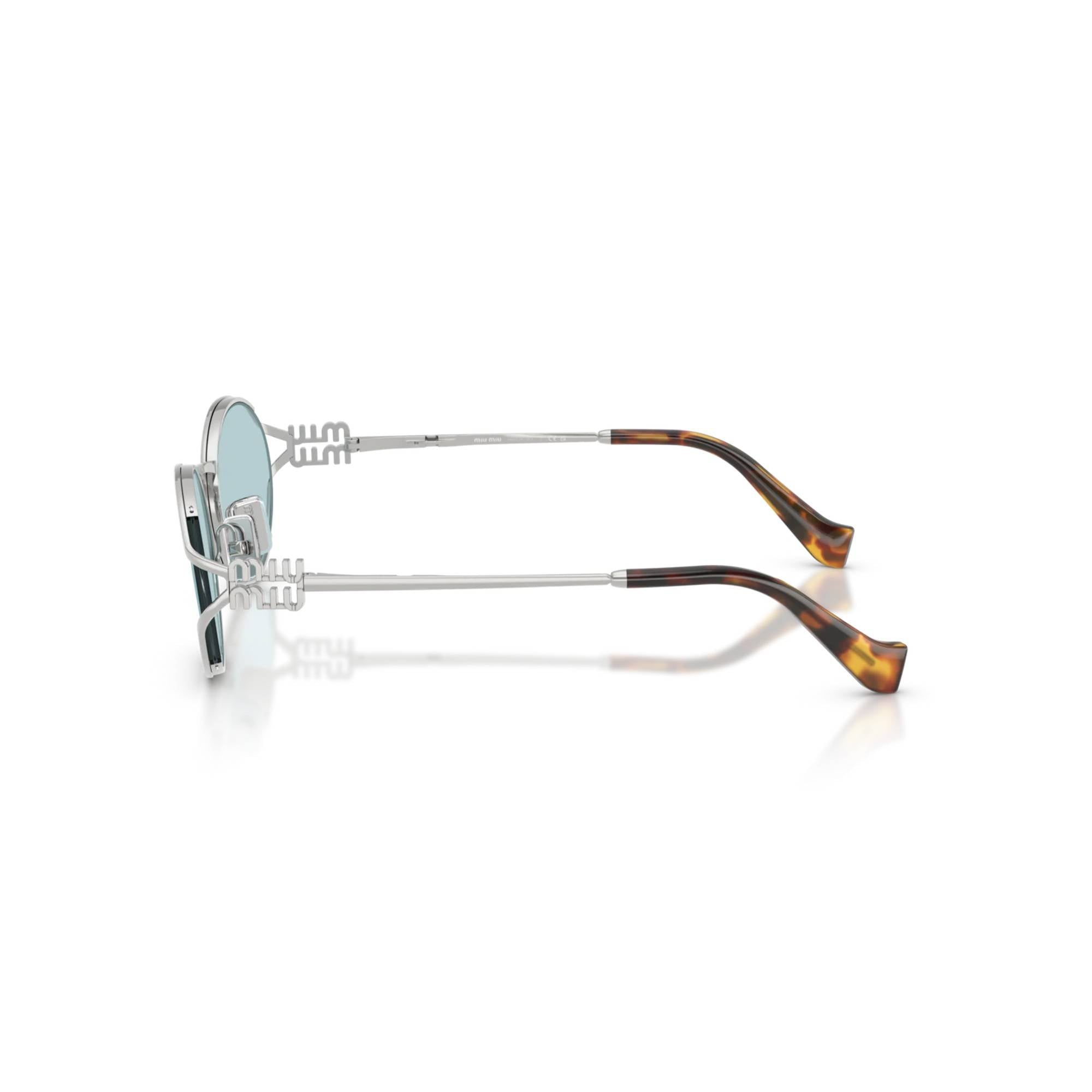 This round Miu Miu sunglass comes in a silver frame with light blue lenses.