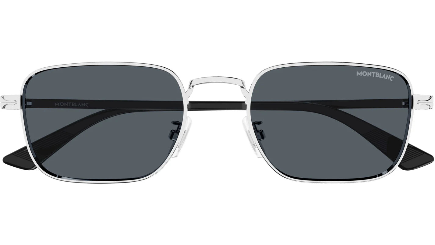 Montblanc sunglasses model MB0339S Nib line rectangle metal frame, color code 003 shiny silver with black temple and solid blue lens.