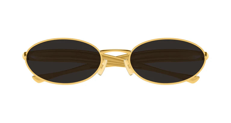 Bottega Veneta BV1386S 001 sunglasses for men and woman, featuring shiny gold panthos metal frame and gradient grey bio nylon lenses. Brand line: Signature Icons. Style code: BV1386S. Color code: 001