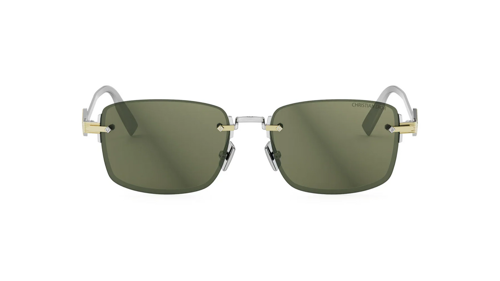 This square Dior sunglass comes in a shiny silver and gold frame with green with light mirror lenses.