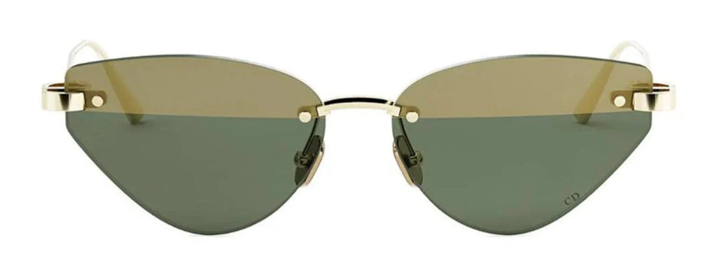 This cat eye Dior sunglass comes in a shiny yellow gold frame with green with semi yellow mirror lenses.