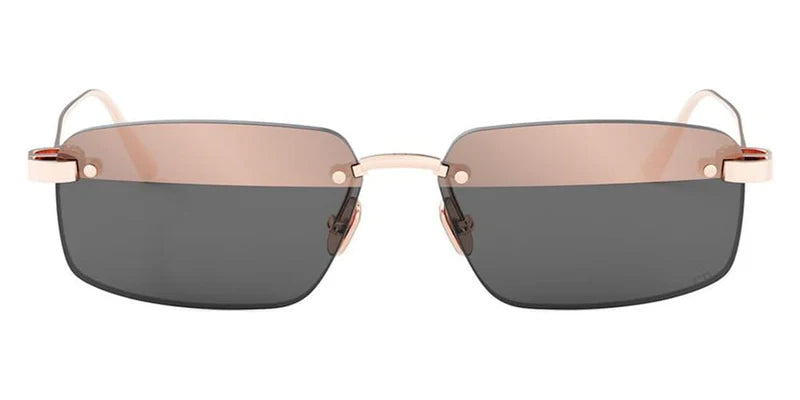 This rectangular Dior sunglass comes in a shiny yellow gold frame with light rose lenses.