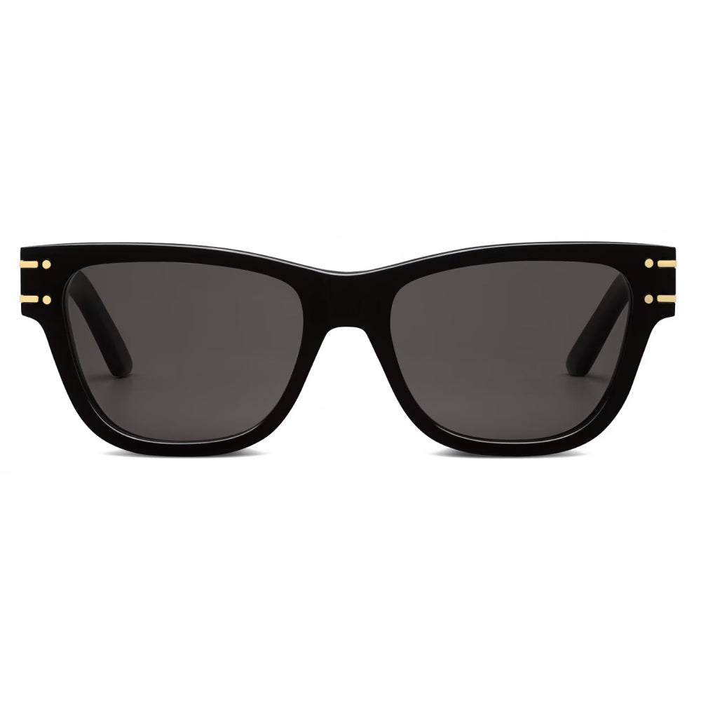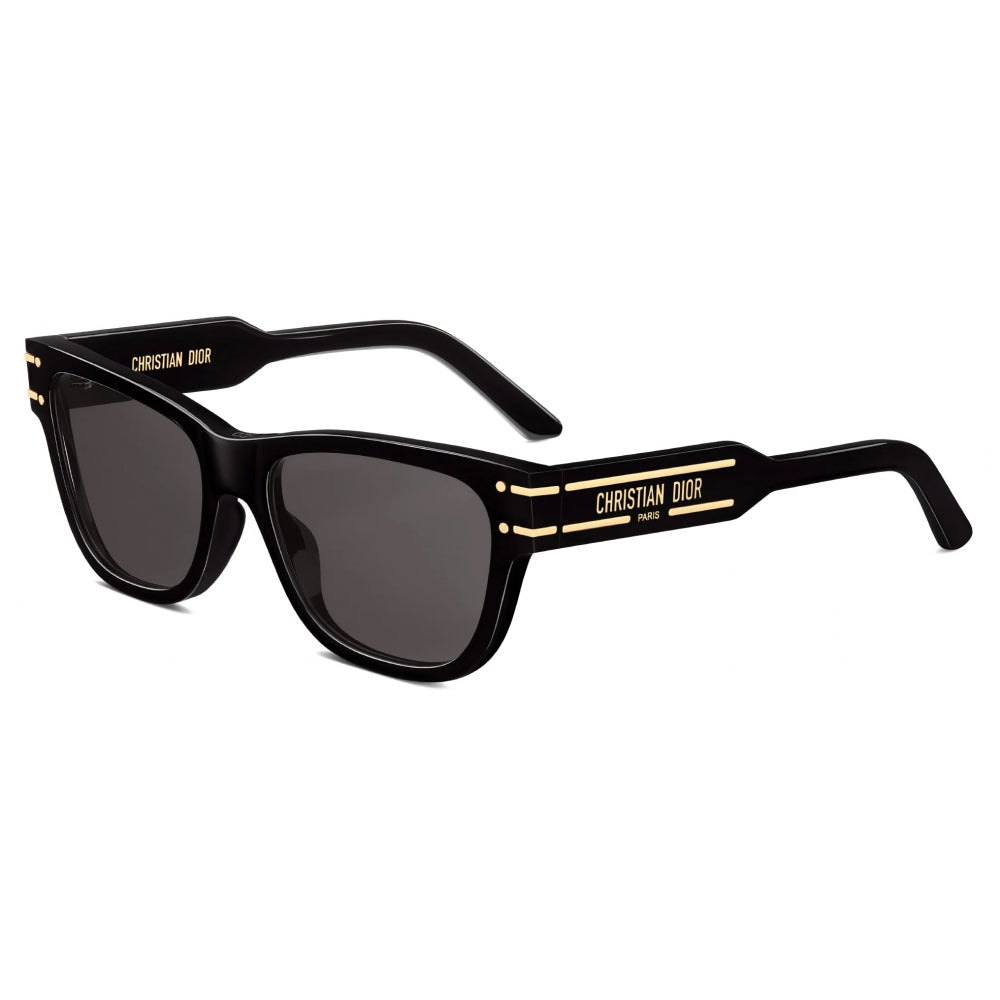 The DiorSignature S6U sunglasses enhance the iconic House line. The couture-spirit design is distinguished by a contemporary and casual low rectangular shape. The black acetate graphic frame features the Christian Dior Paris signature embellished with gold-finish metal lines. Completed by gray lenses, the modern sunglasses will lend a definitively Dior style to any look.