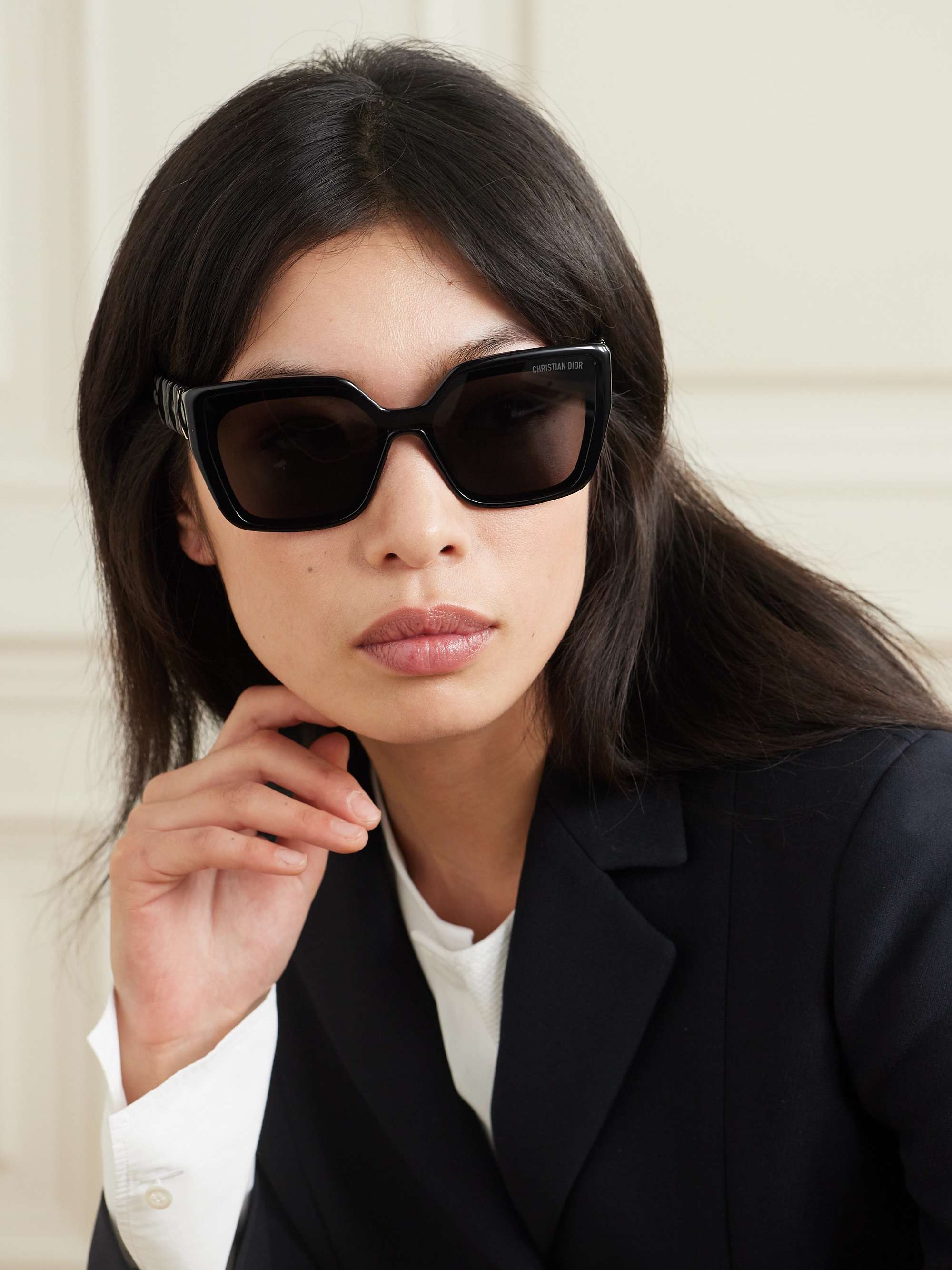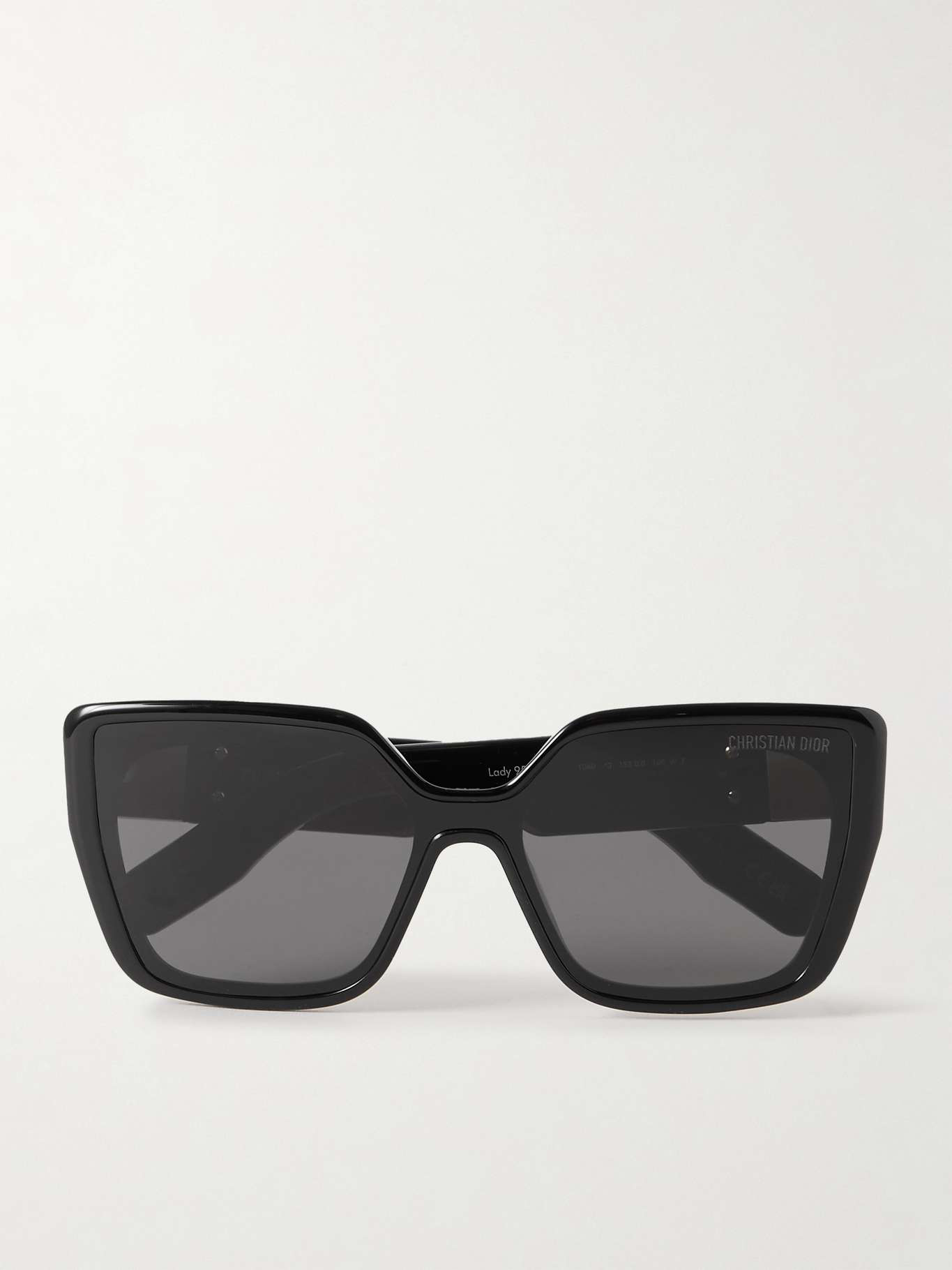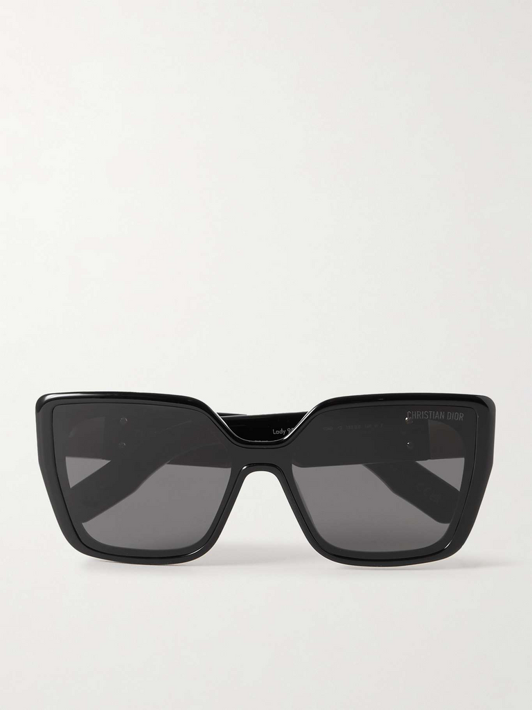 This square Dior sunglass comes in a shiny black and gold frame with grey lenses.