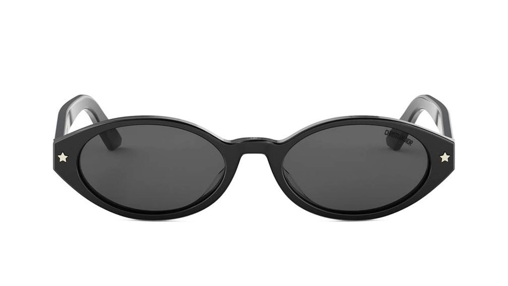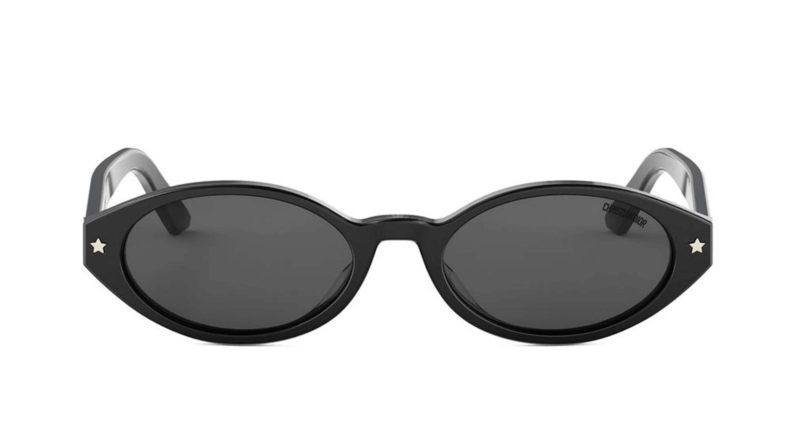 The DiorPacific R1I sunglasses elevate the line with a contemporary low oval shape. The black acetate frame is adorned with gold-finish star details on the front, while the temples feature a white Christian Dior signature. Completed by gray lenses, the essential style will lend an elegant touch to any look.