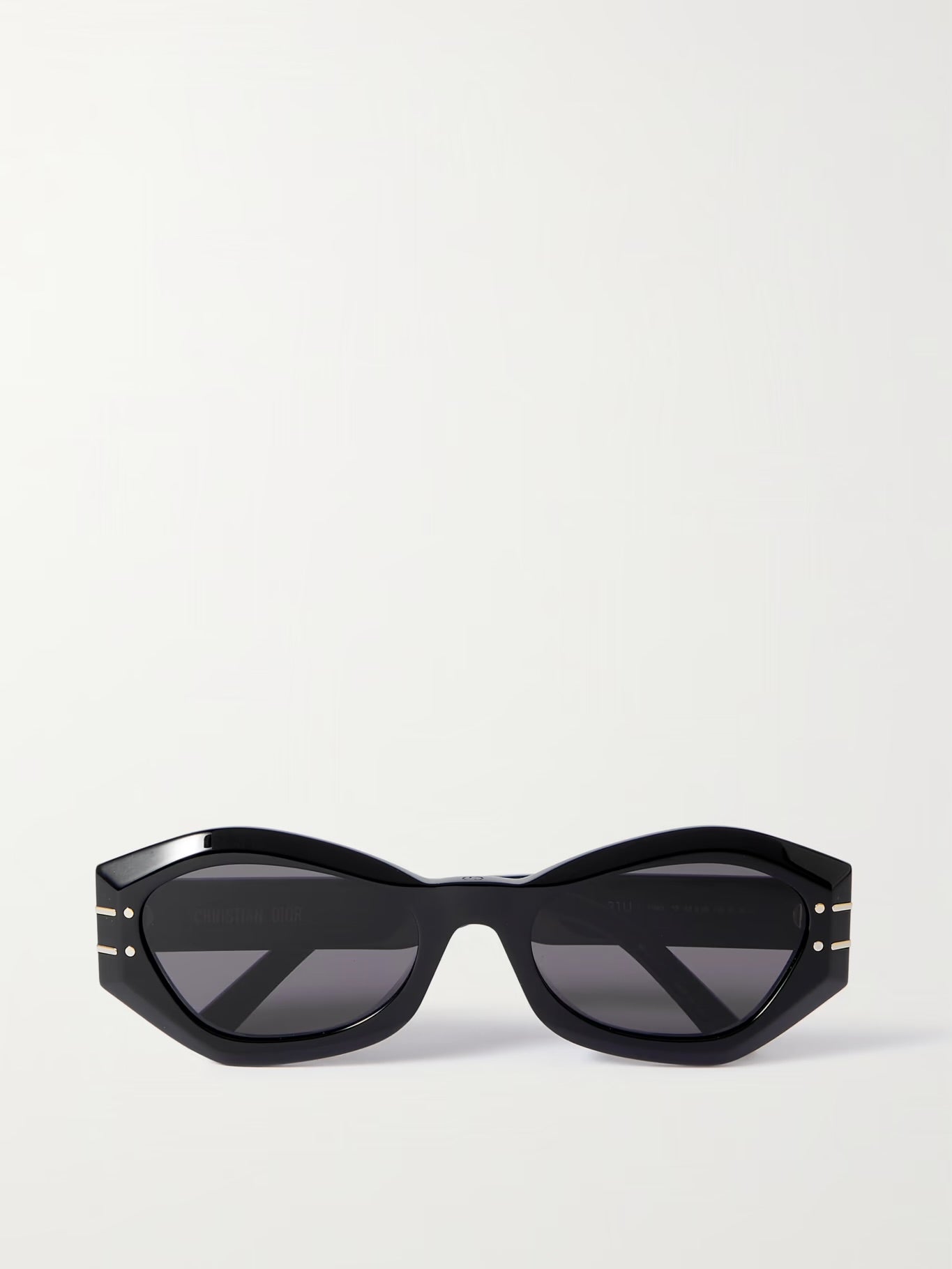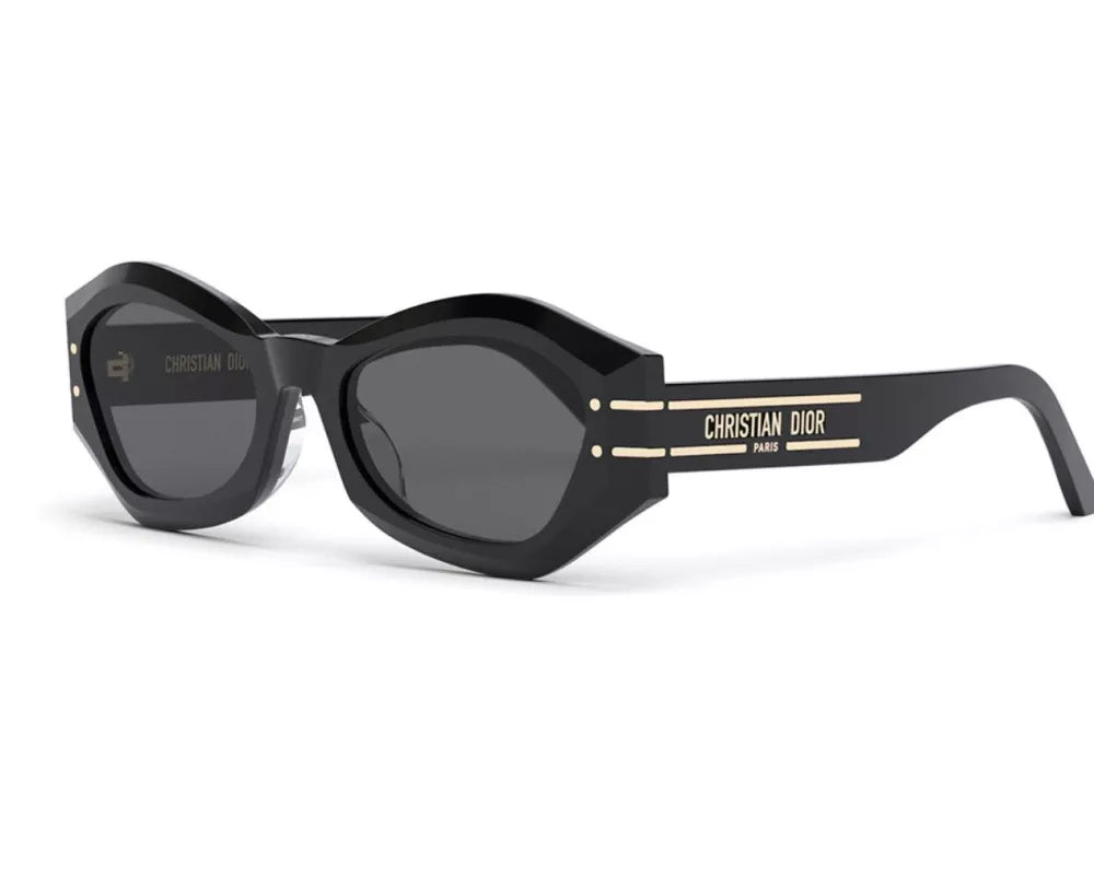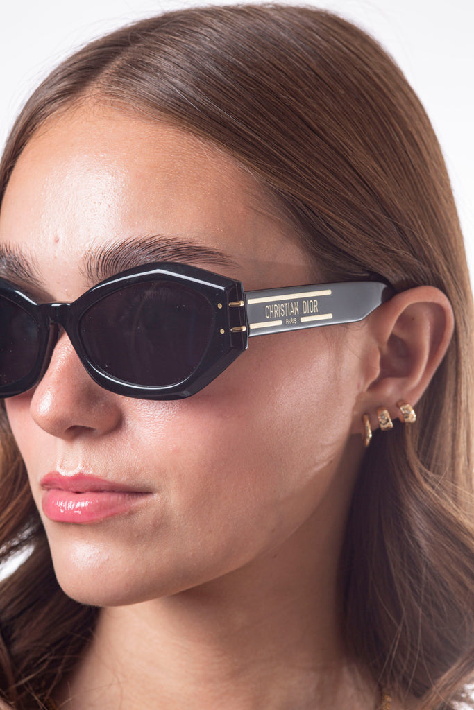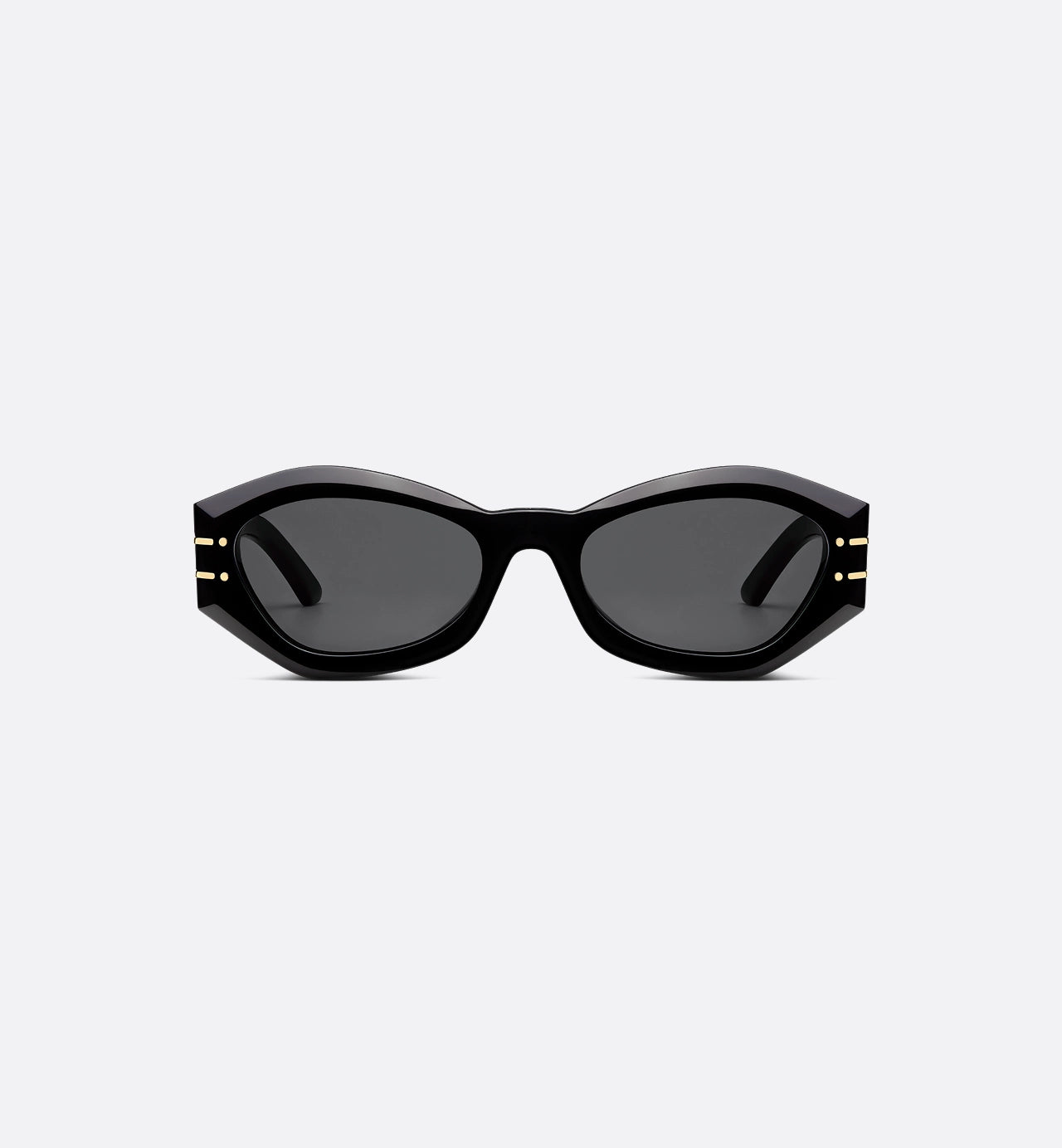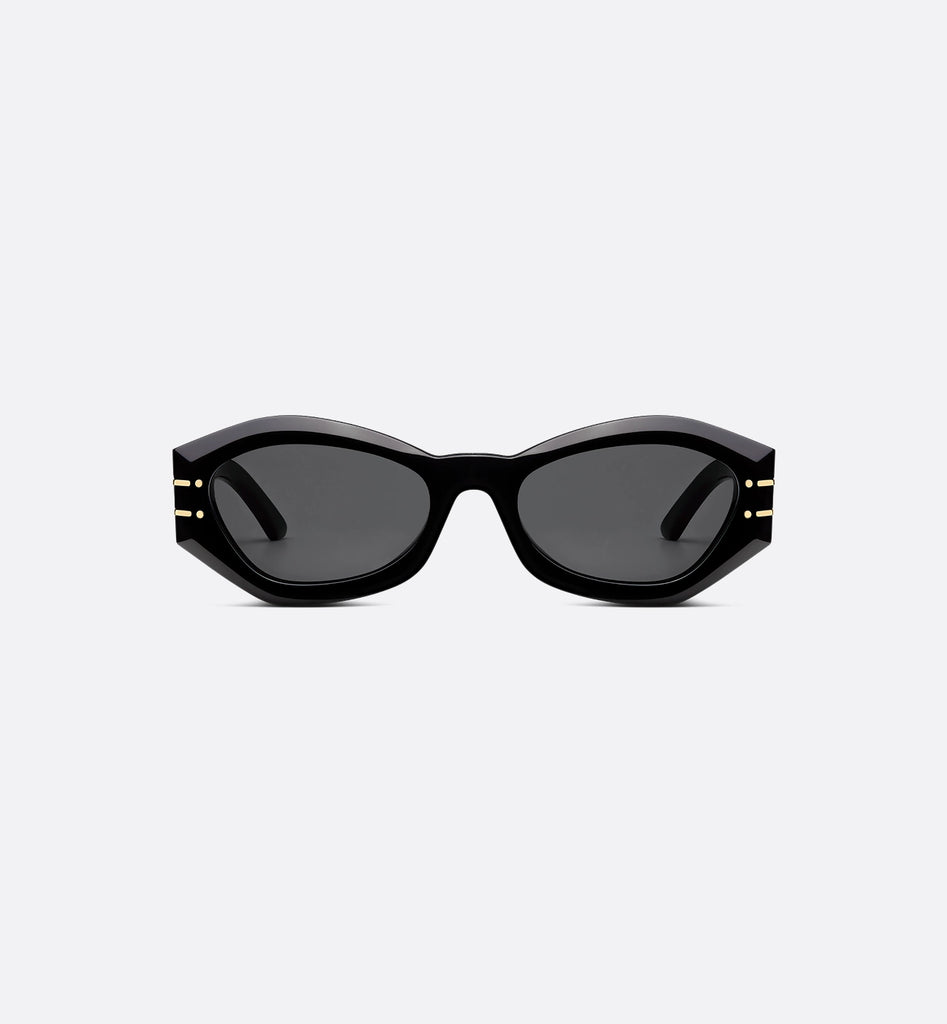 The DiorSignature B1U sunglasses, the House's new iconic line, are a modern and bold butterfly-shaped design. The black acetate frame is distinguished by a play on curves and volumes for a graphic touch while the temples reveal the new 'CHRISTIAN DIOR PARIS' signature, further embellished with a gold-finish metal line that ends at the gray lenses. The new essential will lend a resolutely Dior style to any look.