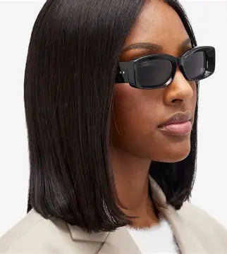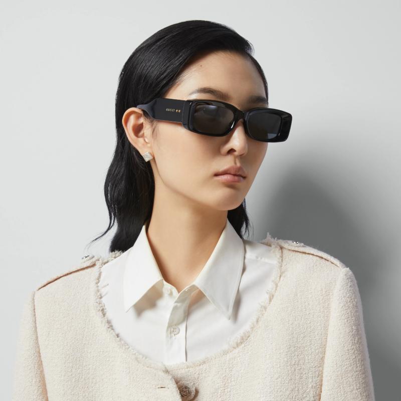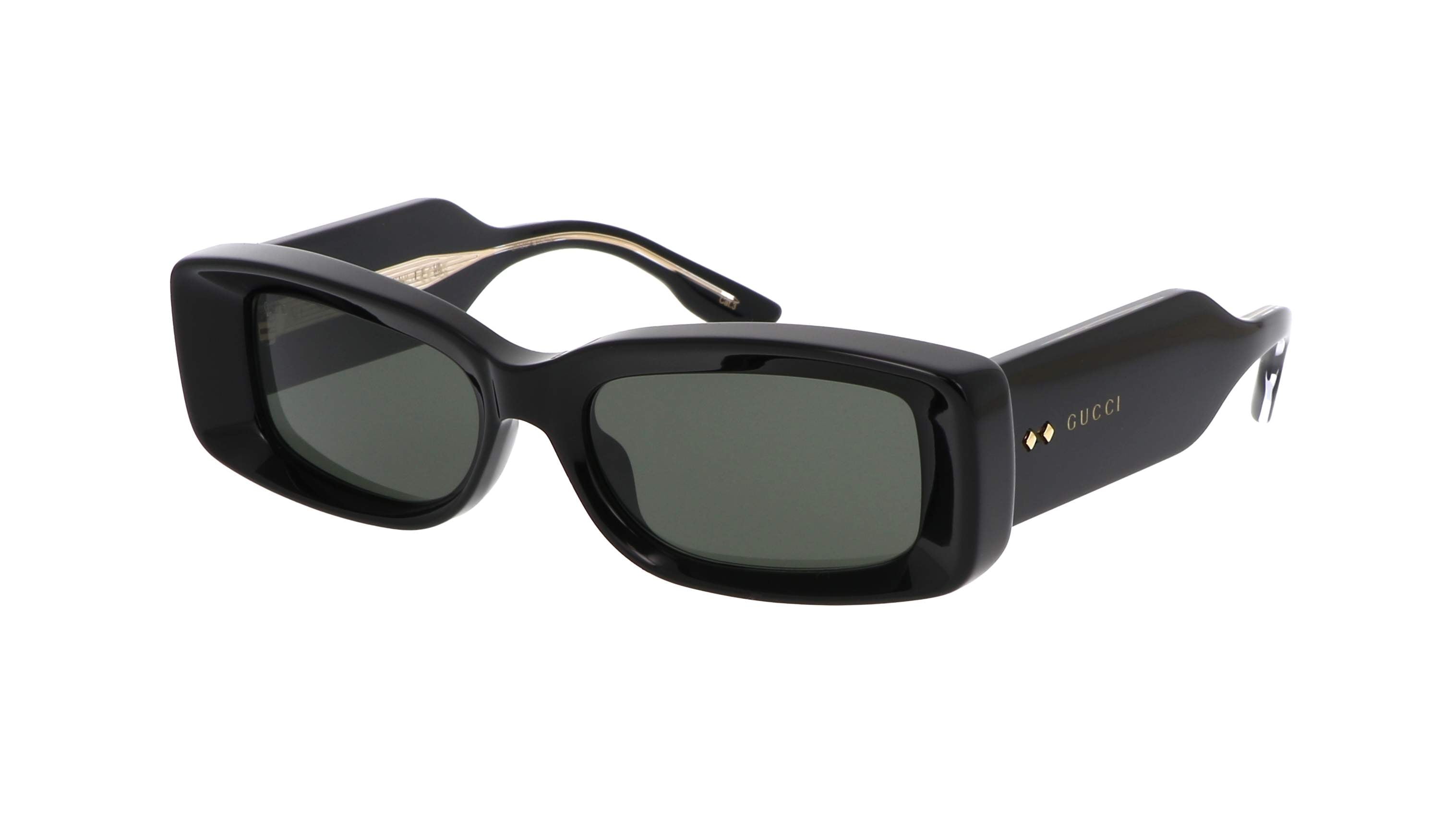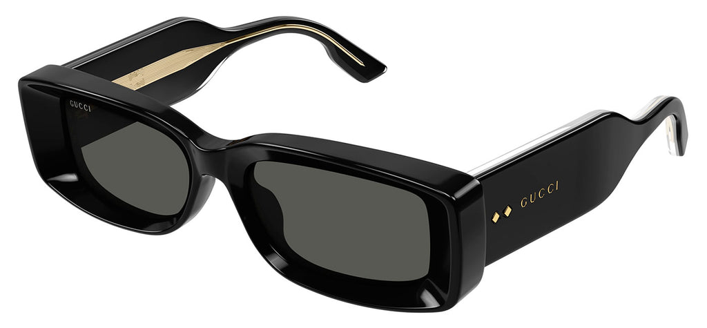Gucci Rivets sunglasses model GG1528S rectangle recycled acetate frame color code 001 shiny black with black temple and solid grey lens.
