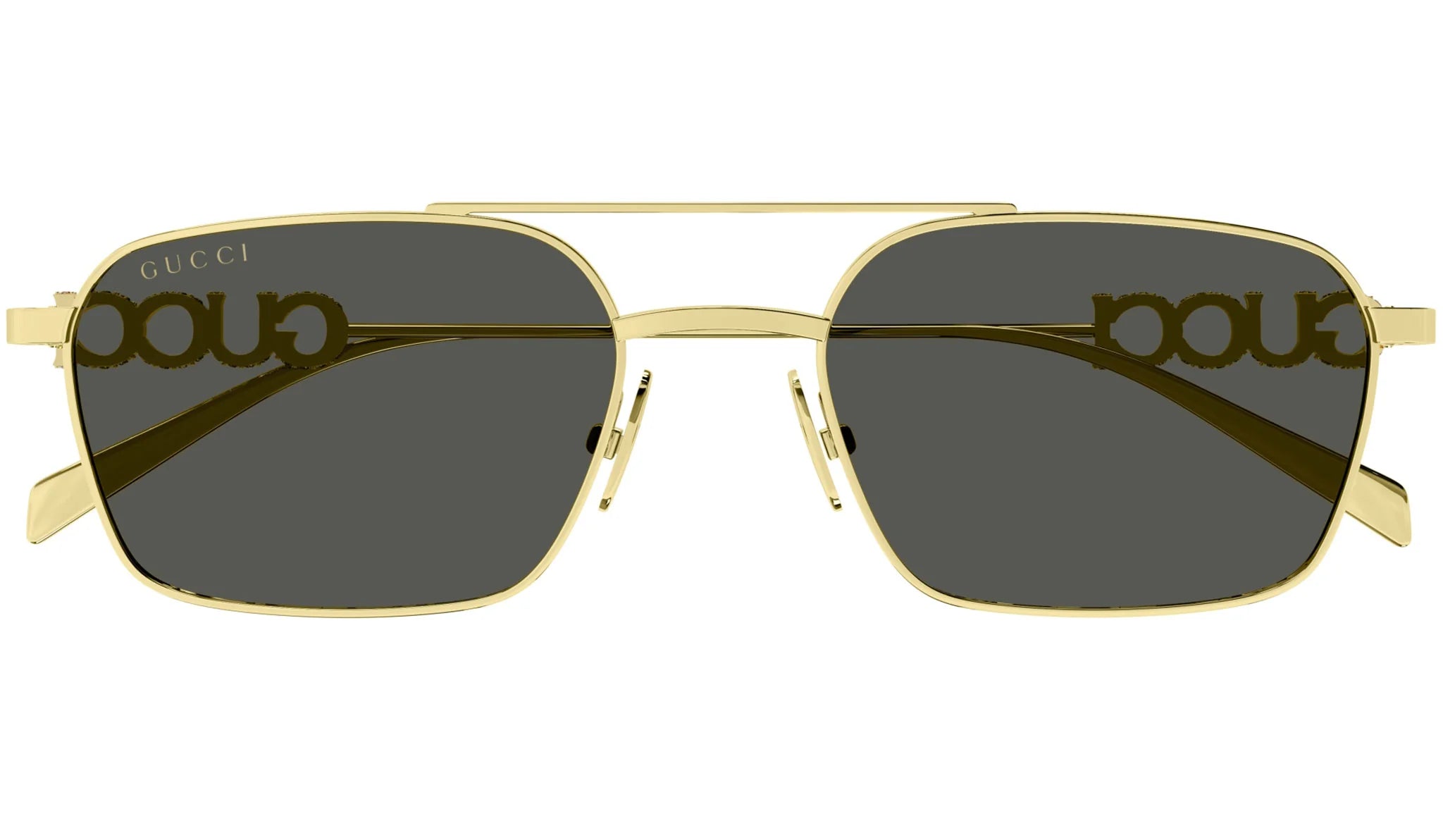 Gucci GG1804S 001 sunglasses for women, featuring shiny yellow gold rectangular metal frame and solid grey bio nylon lenses. Brand line: Lettering. Style code: GG1804S. Color code: 001.