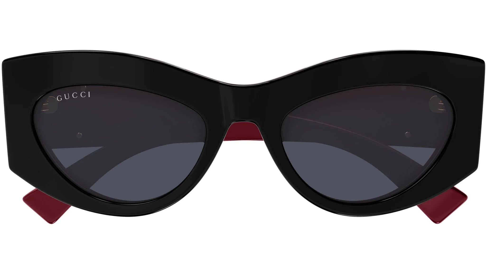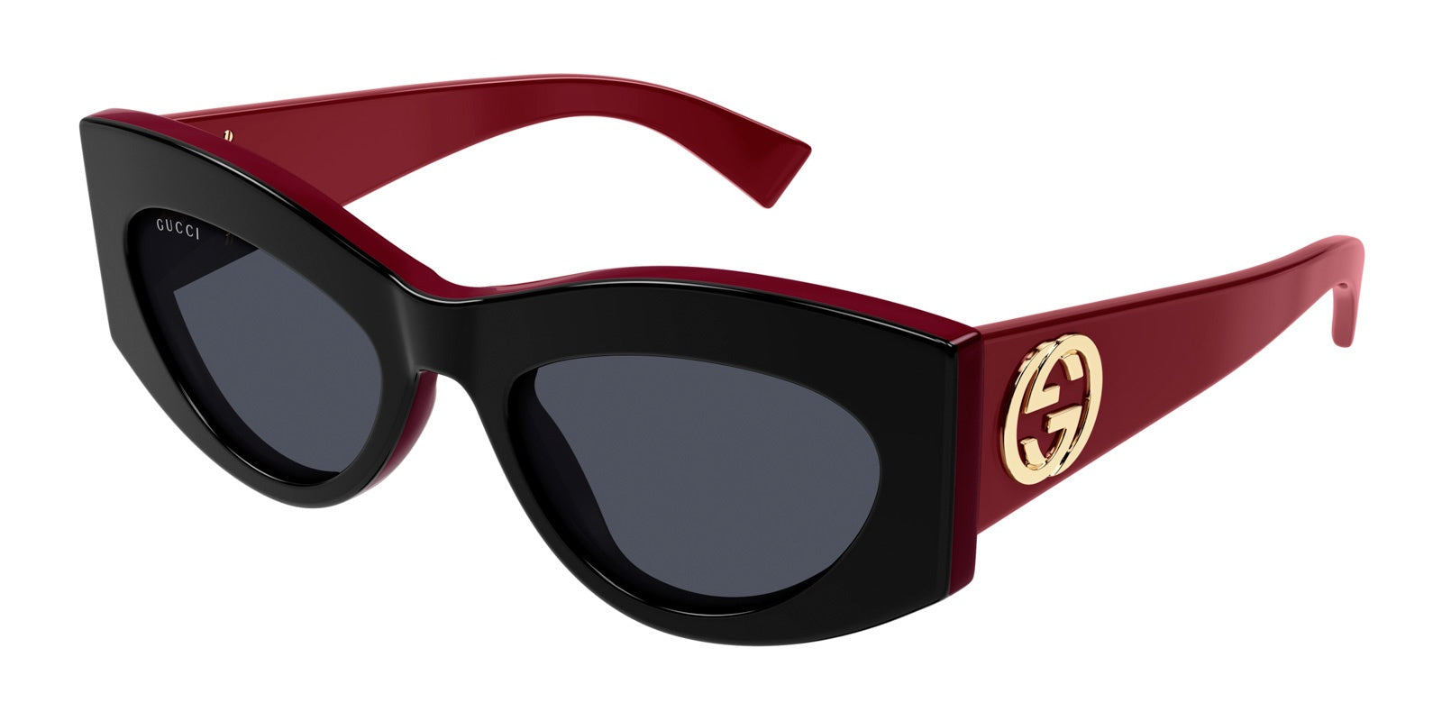 Gucci GG1843S 006 sunglasses for women, featuring shiny bilayer black / solid burgundy cat eye recycled acetate frame and solid grey bio nylon lenses. Brand line: GG Logo. Style code: GG1843S. Color code: 006. Made in Italy