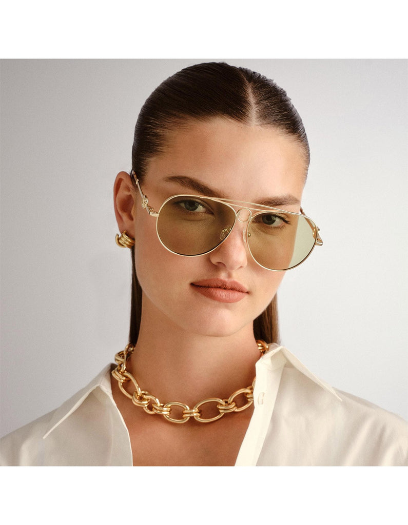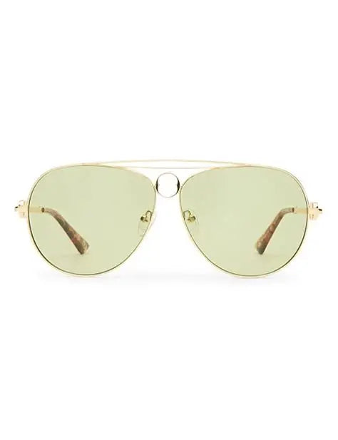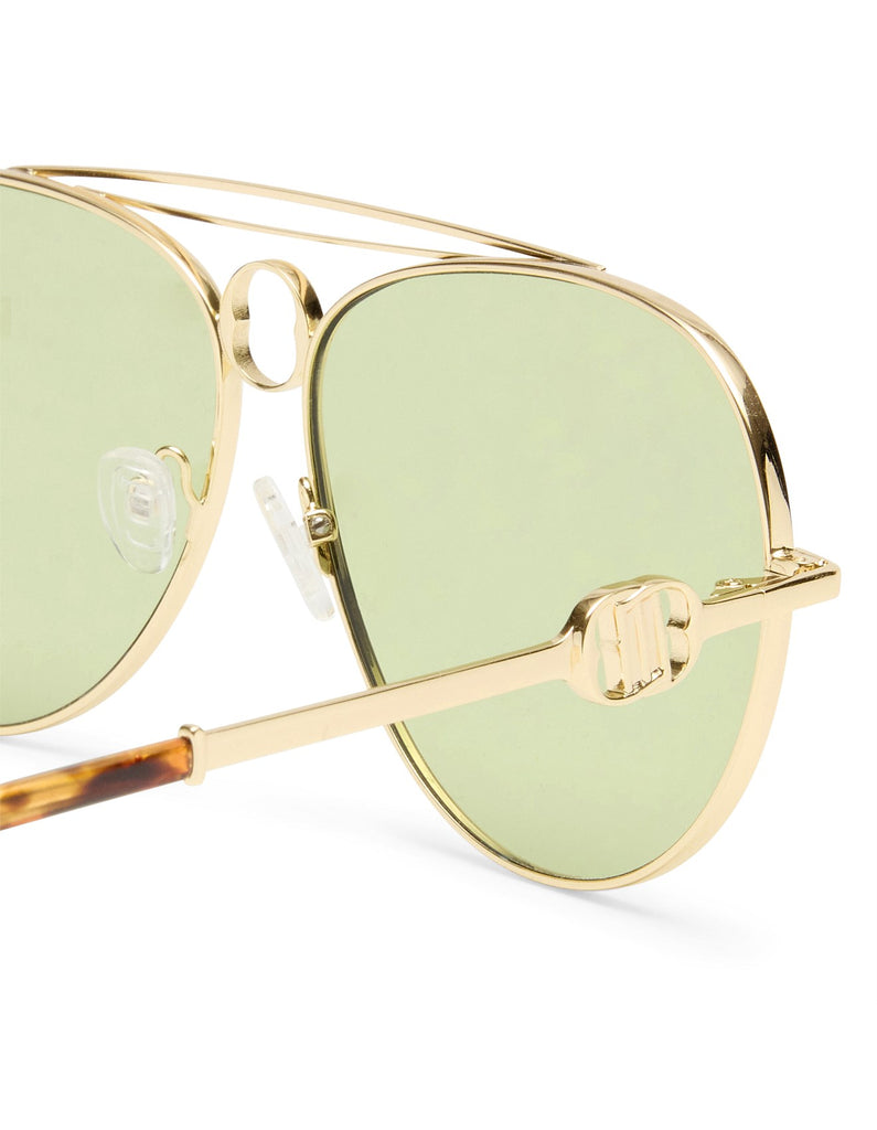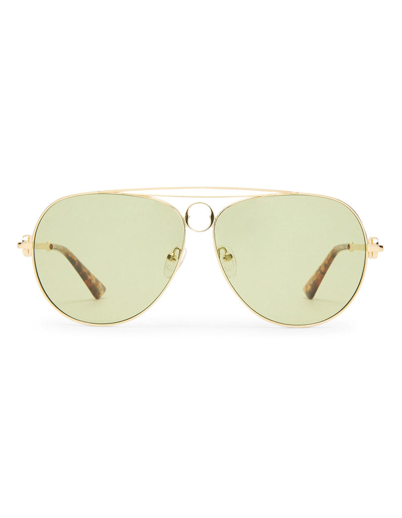 -Finished in a bright gold frame with moss tint lenses.
