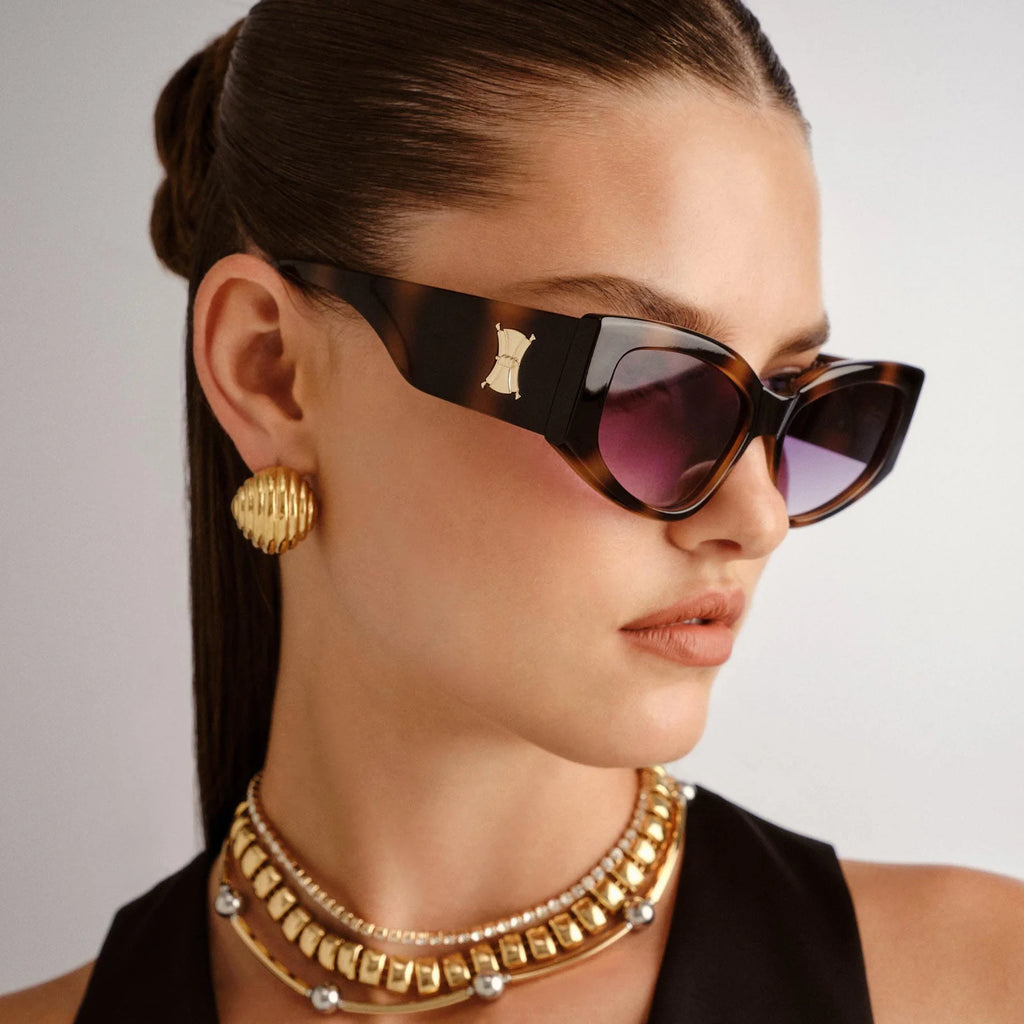 Bold and seductive, our THE HAUNTING sunglasses provide a striking everyday look for all face shapes. This oversized cat-eye style features a thick temples, sculpted frame with a contemporary flat profile, complemented by luxurious heritage flagstripe metal hardware to both temples.