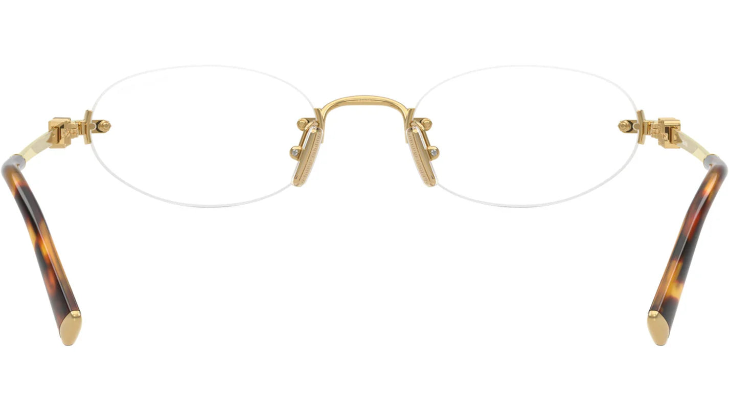 Miu Miu MU A54S 5AK08N sunglasses for women, featuring gold oval metal frame and clear blue light filter bio polyamide lenses. Adjustable nosepads. Brand line: Miu Regard. Style code: 0MU A54S. Color code: 5AK08N.