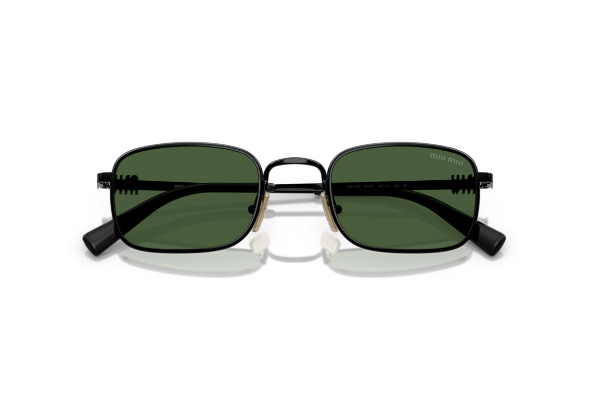 Miu Miu MU A53S ZVN4I0 sunglasses for women, featuring pale gold rectangular metal frame and pink bio polyamide lenses. Adjustable nosepads. Brand line: Miu Regard. Style code: 0MU A53S. Color code: 1AB1I0. Made in Italy.