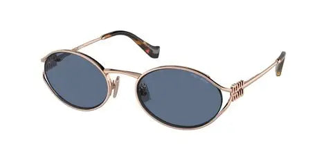 This round Miu Miu sunglasses comes in a pink gold frame with dark blue lenses.
