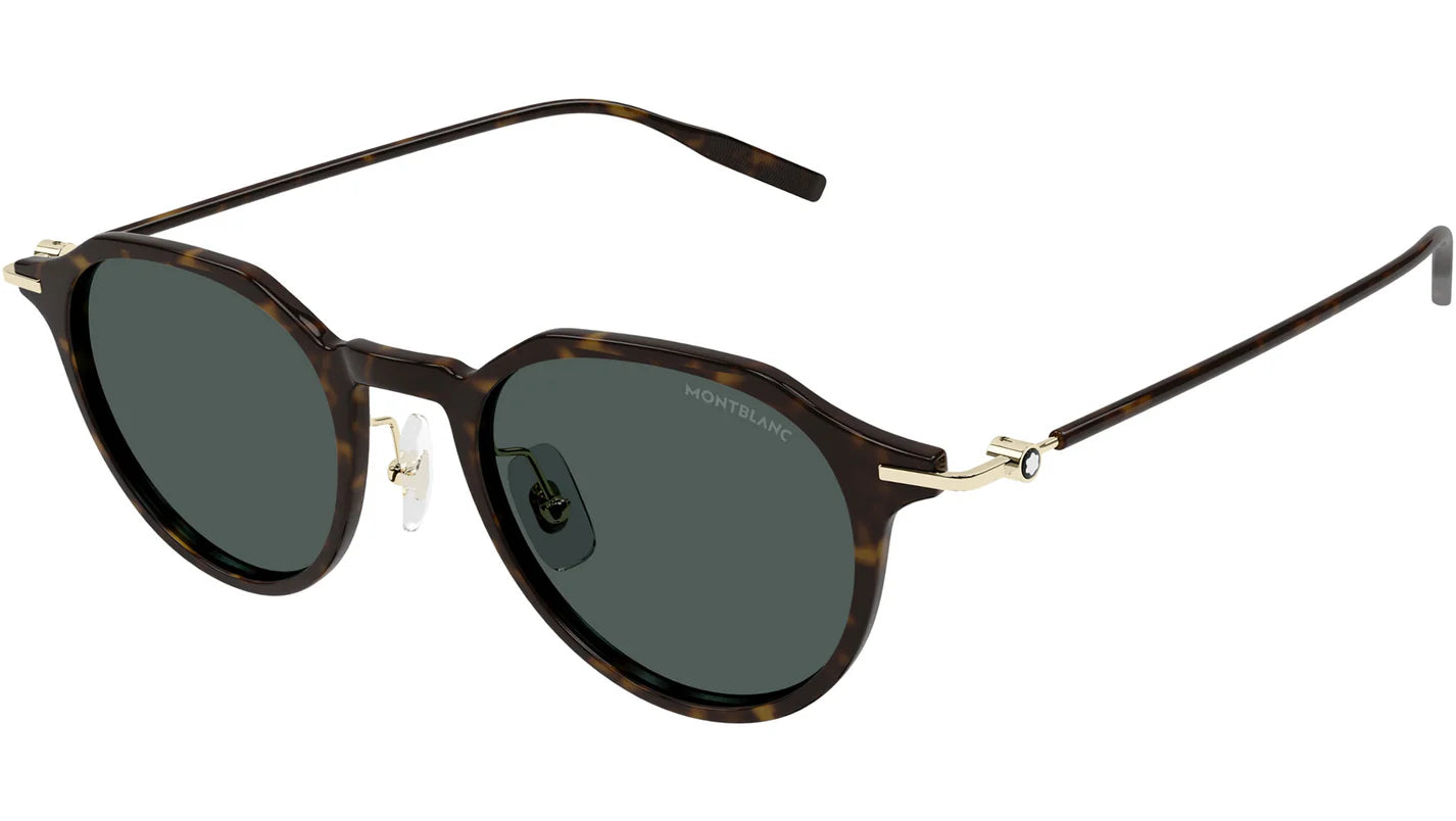 Montblanc Snowcap line sunglasses model MB0355S, panthos injection frame, color code 002 featuring shiny dark havana front with gold temple and solid green lenses.