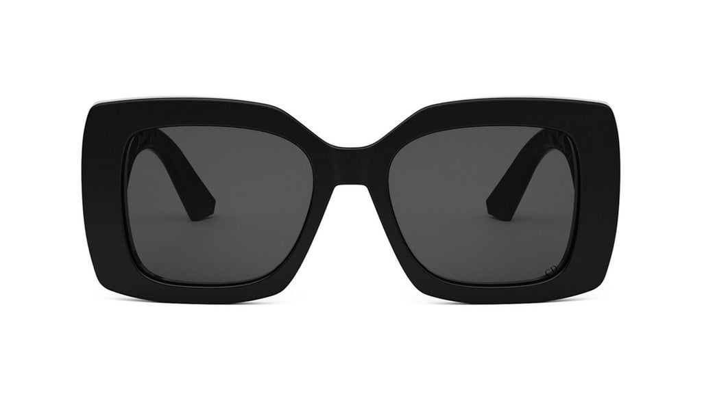 This square Dior sunglass comes in a shiny black frame with grey smoke lenses.